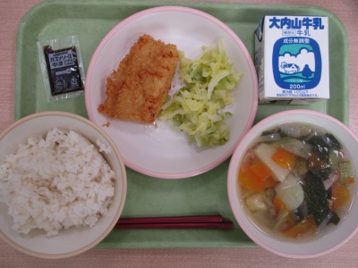 今日のメニューは、「むぎめし」「いかフライ」「そえキャベツ」「チンゲンサイとじゃがいものスープ」「ぎゅうにゅう」です。