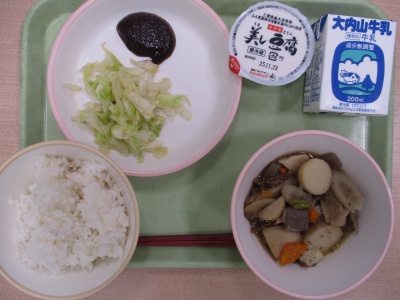 今日のメニューは、「むぎめし」「とうふのみそかけ」「いもに」「こうみづけ」「ぎゅうにゅう」です。