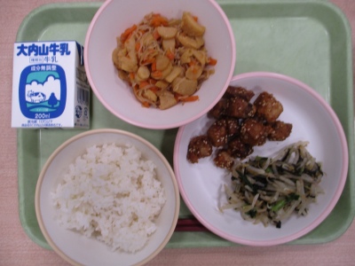 今日のメニューは、「むぎめし」「かつおのごまからめ」「まこもだけのきんぴら」「いそかあえ」「ぎゅうにゅう」です。