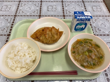 今日の給食は、学期に1回出される人気メニュー「津ギョーザ」でした。15cmの大きな津ギョーザは手作りです。朝から、720個の津ギョーザを調理員さんたちが一生懸命作ってくださいました。いつもおいしくいただいています。ごちそうさまでした。