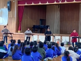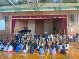 南郊公民館では、大正琴のサークルがあります。他のサークルでも教えてみえる4人の方たちに来ていただき、大正琴の演奏を聞かせてもらいました。大正琴の演奏を聞いた子はあまりなく、興味津々に演奏を聞いていました。大正琴は、ピアノの「ジャーン」というようなたくさんの音をいっしょに出すことはできない楽器で、1つの音しか出ないそうです。4人の方が、4つの高さの違う音を出し、素敵な演奏をしていただきました。楽器の話を聞いたり、いっしょに歌ったりして楽しいひと時でした。