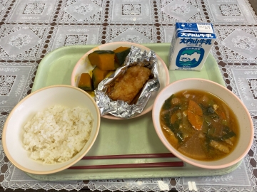 12月22日が冬至なので、今日はかぼちゃが出ました。1年の中で、一番昼の時間が短い冬至にビタミンの多いかぼちゃを食べると風邪をひかない、と言われています。かぼちゃを食べたり、体をあたためるゆず湯につかったりして、寒い冬を健康に過ごしてほしいと思います。今日で2学期の給食が終わりました。毎日安全でおいしい給食をありがとうございました。3学期は1月9日から始まります。