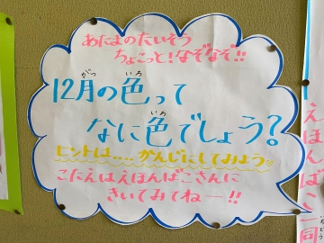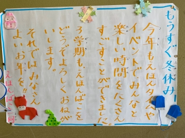 金曜日に図書館の環境整備をしていただき誠にありがとうございました。本に親しむ機会をたくさん作っていただきました。えほんばこさんより2学期最後にメッセージを掲示していただきました。12月は何色?(ヒントは12月を漢字で書くとわかるそうです)のクイズもいっしょに掲示されていました。3学期もよろしくお願いします。今日は、子どもたちが大掃除をして身の回りや学校をきれいにしてくれました。明後日からの冬休みが楽しみです。