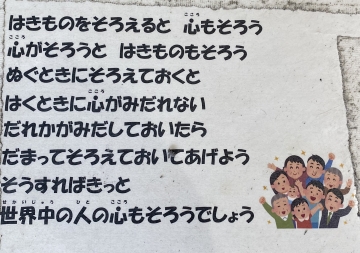 1年生横のトイレのスリッパがとてもきれいに並べられていました。私は4月から高茶屋小学校に来ていますが、きれいに並べられていることが多いです。「ぐちゃぐちゃ」というのは見たことがありません。通りかかった教職員がそろえることもありますが、子どもたちも意識してそろえて脱いでいます。とてもいい習慣です。そろったスリッパの横には、次の言葉が添えられていました。