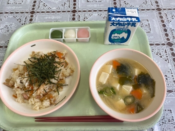 今日は、明日3月3日の「ひなまつり」にちなんだ行事メニューで、ちらしずし、白みそ汁、三色団子が出ました。ひなまつりは、子どもの健やかな成長を祝う行事です。三色団子の色は春の喜びを表しているそうです。