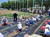 学校支援本部の農業ボランティアの方々にお世話になり、1年生から3年生がサツマイモのつるを植えました。