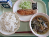 【さけフライ そえキャベツ 麦飯 五目汁 牛乳】