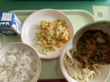 【肉みそうどん 中華コーンサラダ 麦飯 牛乳】