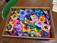 せめてつながりを作ろうと、1年生が折り紙でコマを作って渡し