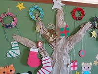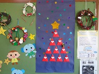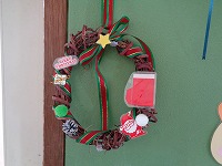 さつまいもツルでクリスマスリースを作って、廊下に飾っています。