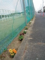 校舎前花壇と校門の花壇、フェンス沿いに、色とりどりの