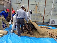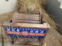 地域の方4人に助けていただき、大変古い道具である「足ふみ脱穀機」