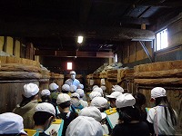 辻岡醸造では昔ながらの方法で木の大きな樽で味噌や醤油を