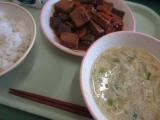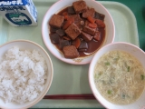 【厚揚げのみそ炒め 卵スープ 麦飯 牛乳】