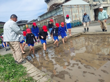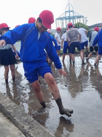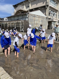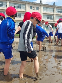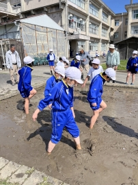 「初めての感触~」「案外、気持ちいい~」と、子どもたちは楽しそうに代かき体験をしていました。