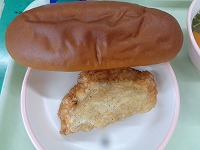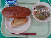 今日の給食は「津ぎょうざ」。大きな皮にぎょうざのアンを包み、