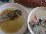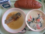 【アレッタの豆乳チャウダー 鮭のアップルソースかけ 黒糖パン 牛乳】