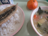 【いわしのかば焼きどんぶり 白みそ汁 牛乳 みかん】