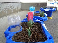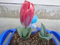 1年生の鉢植えのチューリップが2つ咲きました。ここ数日雨が降ったり