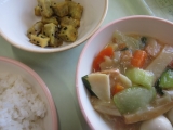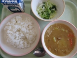 【カレーポトフ 鮭の和風カップ焼き 麦飯 牛乳】