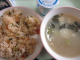 【里芋と大根のそぼろ煮 きびなごのから揚げ 白菜漬け 麦飯 牛乳】
