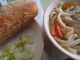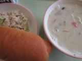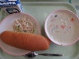 【ツナのクリームソーススパゲッティ 大豆サラダ パン 牛乳】