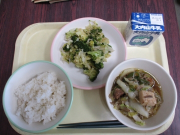 今日のメニュー・・・麦ごはん かしわのじゅんじゅん ブロッコリーの梅風味和え
