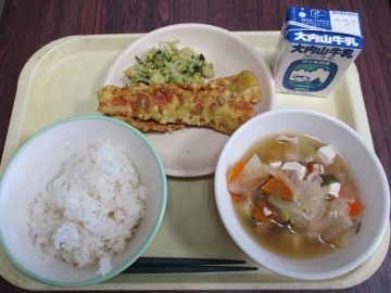 今日のメニュー・・・麦ごはん ちくわのカレー揚げ 五目汁 白菜と水菜の即席漬け