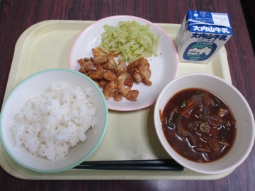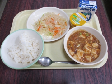 今日のメニュー・・・麦ごはん 麻婆豆腐 バンサンスー みかんゼリー 牛乳