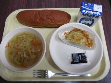今日のメニュー・・・黒糖パン ツナ入りカレーコロッケ ジュリアンスープ 牛乳