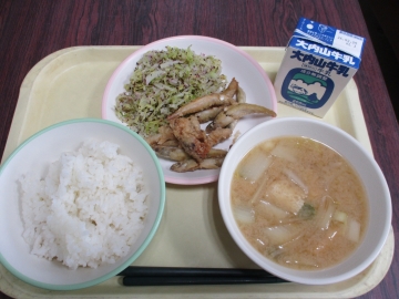 今日のメニュー・・・麦ごはん とりごぼう 一揆みその味噌汁 ごま塩キャベツ 牛乳