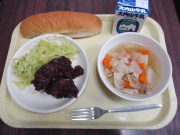 今日のメニュー・・・セルフあんぱん 和風ポトフ キャベツの浅漬 牛乳
