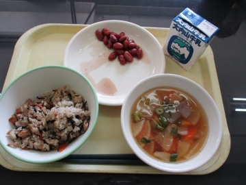 今日のメニュー・・・ひじきご飯 のっぺい汁 金時豆のあまに 牛乳