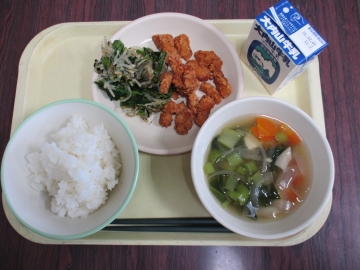 今日のメニュー・・・麦ごはん いかのかりん揚げ ほうれん草ともやしの礒香あえ