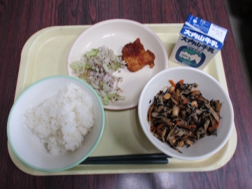 今日のメニュー・・・麦ごはん いかの甘辛揚げ 大豆の磯煮 しそあえ 牛乳