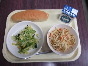 今日のメニュー・・・減量ロールパン ツナの和風スパゲティ 小松菜のサラダ 牛乳