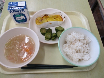 今日のメニュー・・・麦ごはん しいらのカレー風味焼き 野菜スープ
