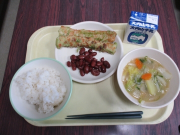 今日のメニュー・・・麦ごはん ちくわの磯辺あげ 石狩汁 金時豆 牛乳