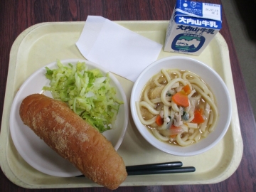 今日のメニュー・・・きなこ揚げパン(減量) 信田うどん キャベツの甘酢づけ