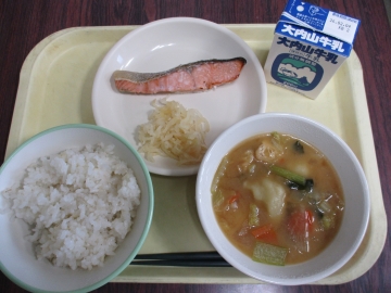 今日のメニュー・・・麦ごはん すいとん 鮭の塩焼き たくあん 牛乳