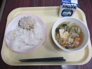 今日のメニュー・・・麦ごはん ワンタンスープ チンジュワンズ 牛乳