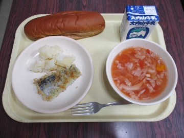 今日のメニュー・・・黒糖パン さわらのパン粉焼き 粉ふきいも トマトのスープ