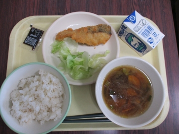 今日のメニュー・・・麦ごはん サーモンフライ そえレタス 五目汁 牛乳