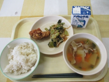 今日のメニュー・・・麦ごはん ワンタンスープ とりのから揚げ ナムル 牛乳