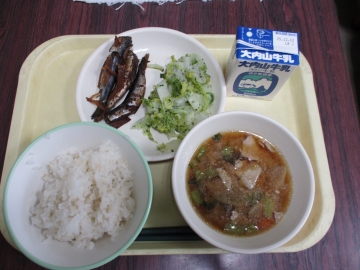 今日のメニュー・・・麦ごはん いわしの甘露煮 豚汁 白菜の青じそあえ 牛乳