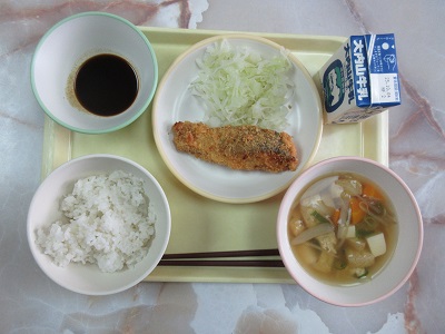 〇むぎごはん さけフライ そえキャベツ ごむくじる 牛乳