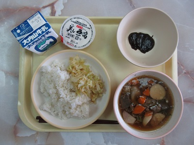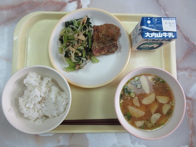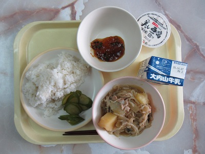 〇むぎごはん とうふのみそかけ いもに こうみづけ 牛乳