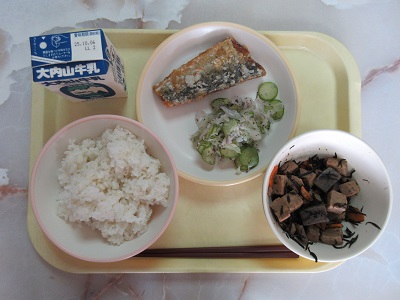 〇むぎごはん さわらのたつたあげ こうやどうふとひじきのにもの しそあえ 牛乳