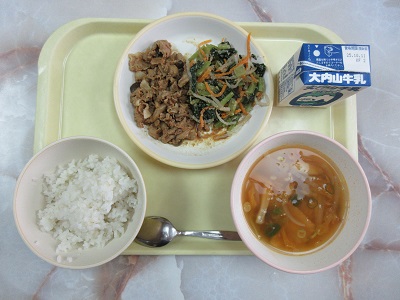 〇むぎごはん ビビンバ キムチスープ 牛乳