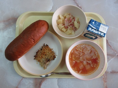 〇こくとうパン シイラのパンこやき ジャーマンポテト ミネストローネ 牛乳